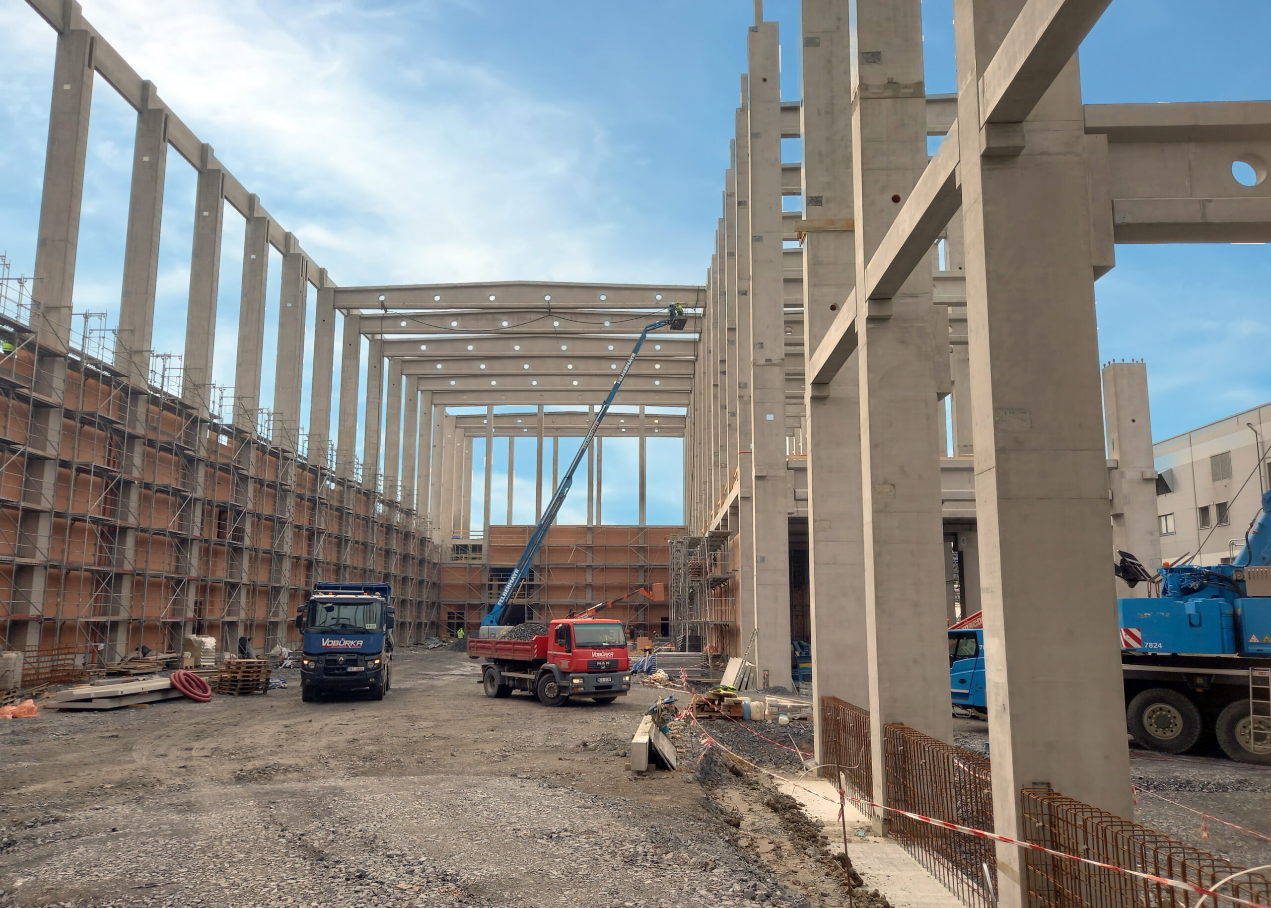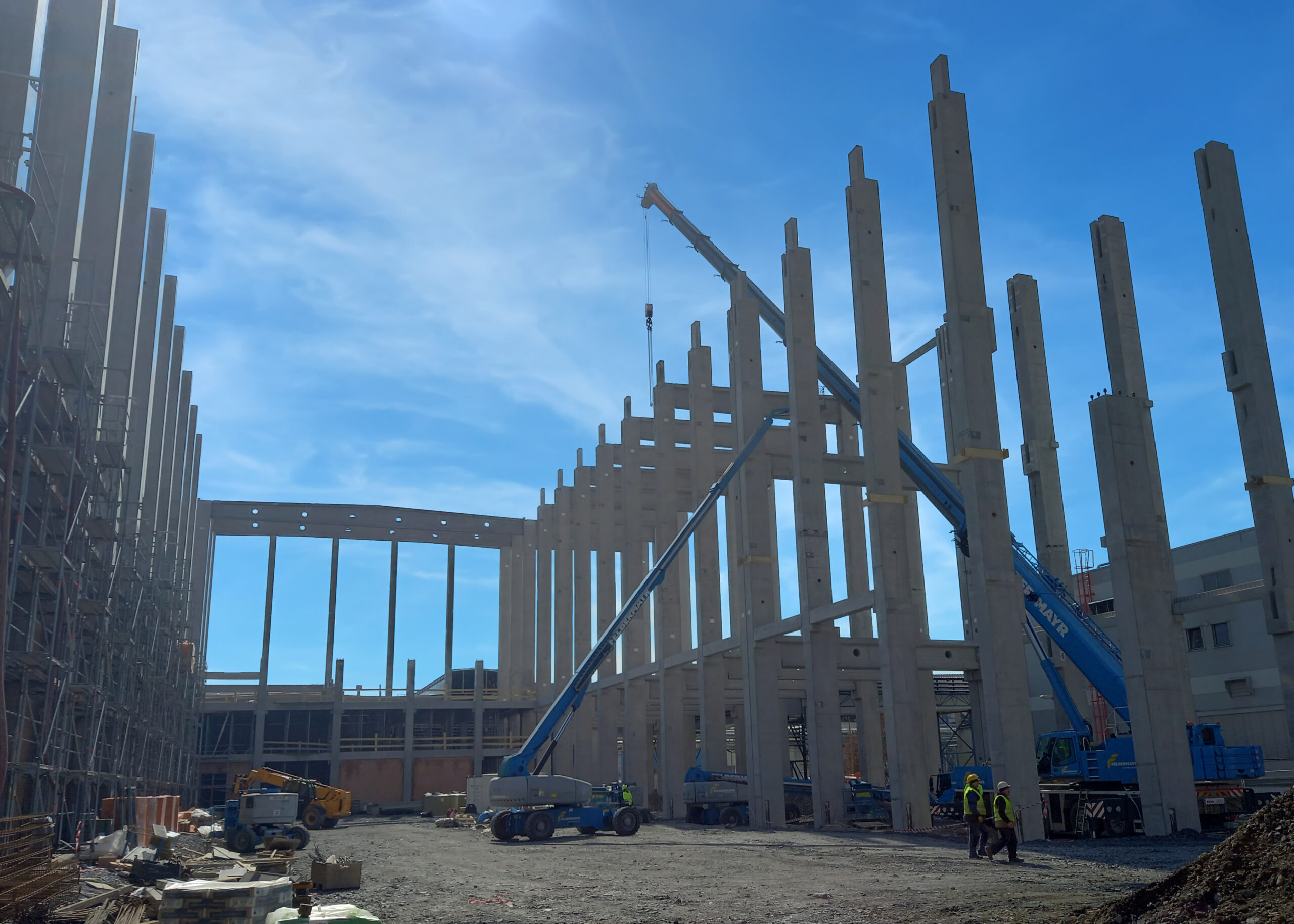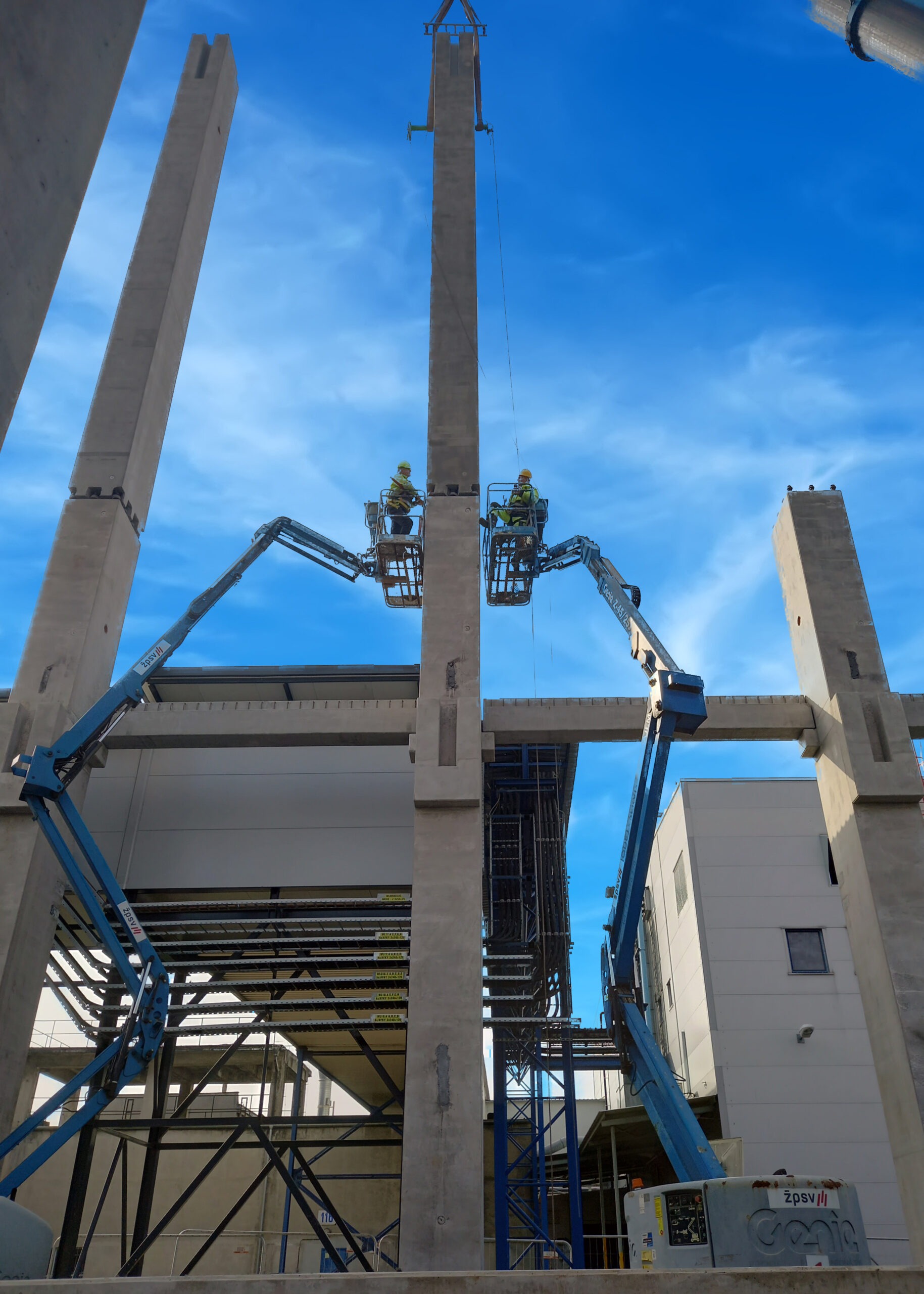 Na projektu nové skladové haly HBS jsme zajišťovali kompletní dodávku a montáž železobetonového skeletu. Součástí bylo i osazení kotevních bodů a vylamovacích výztuží HBT dle specifikace, včetně dodávky kotevního systému pro napojení na monolitické části. Prefabrikáty byly vyráběny s hladkým povrchem v přírodním odstínu šedé a montáž proběhla v jednom nájezdu z rovné připravené plochy, včetně všech nutných spojů a zálivek. Součástí dodávky byla také prováděcí a výstupní dokumentace.